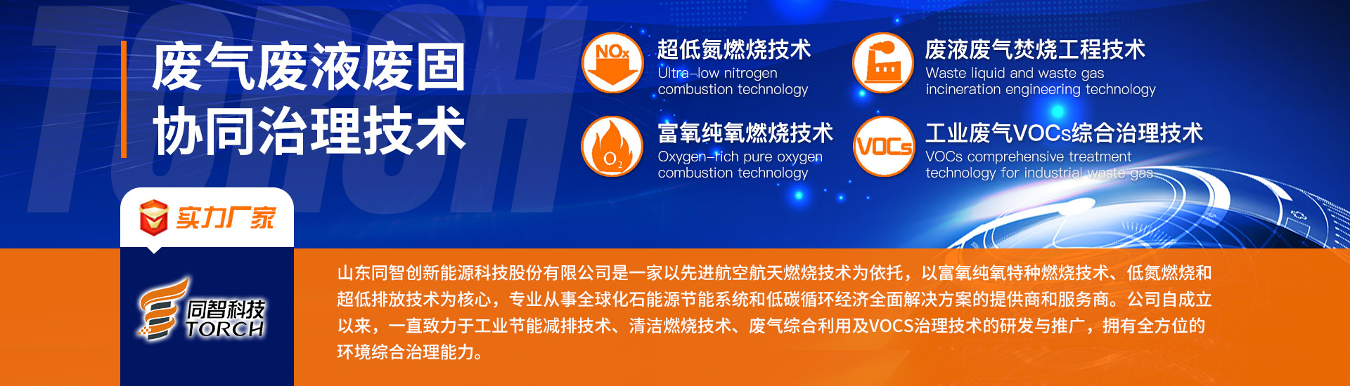 山東同智創(chuàng)新能源科技股份有限公司是一家以先進(jìn)航空航天燃燒技術(shù)為依托,以富氧純氧特種燃燒、低氮燃燒和超低排放技術(shù)為核心,專業(yè)從事全球化石能源節(jié)能系統(tǒng)和低碳循環(huán)經(jīng)濟(jì)全面解決方案的提供商和服務(wù)商。公司自成立以來,一直致力于工業(yè)節(jié)能減排技術(shù)、清潔燃燒技術(shù)、廢氣綜合利用及VOCs治理技術(shù)的研發(fā)與推廣,擁有國內(nèi)一流的環(huán)境綜合治理能力,是節(jié)能環(huán)保行業(yè)的領(lǐng)導(dǎo)者。